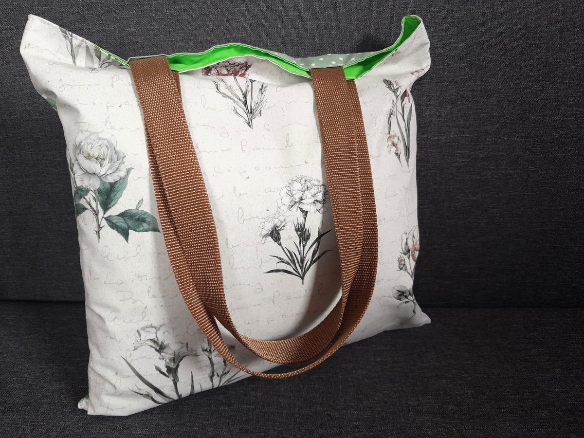 Nabízím tašku šitou z látky s písmem a květinami. Zadní strana je zelenkavý puntík. Taška je vypodšitá s vnitří kapsou. Horní lem je dvakrát prošitý aby pěkně držela. Ucha jsou dostatečně dlouhá pro nošení v ruce i přes rameno. Zapínání na magnetek.