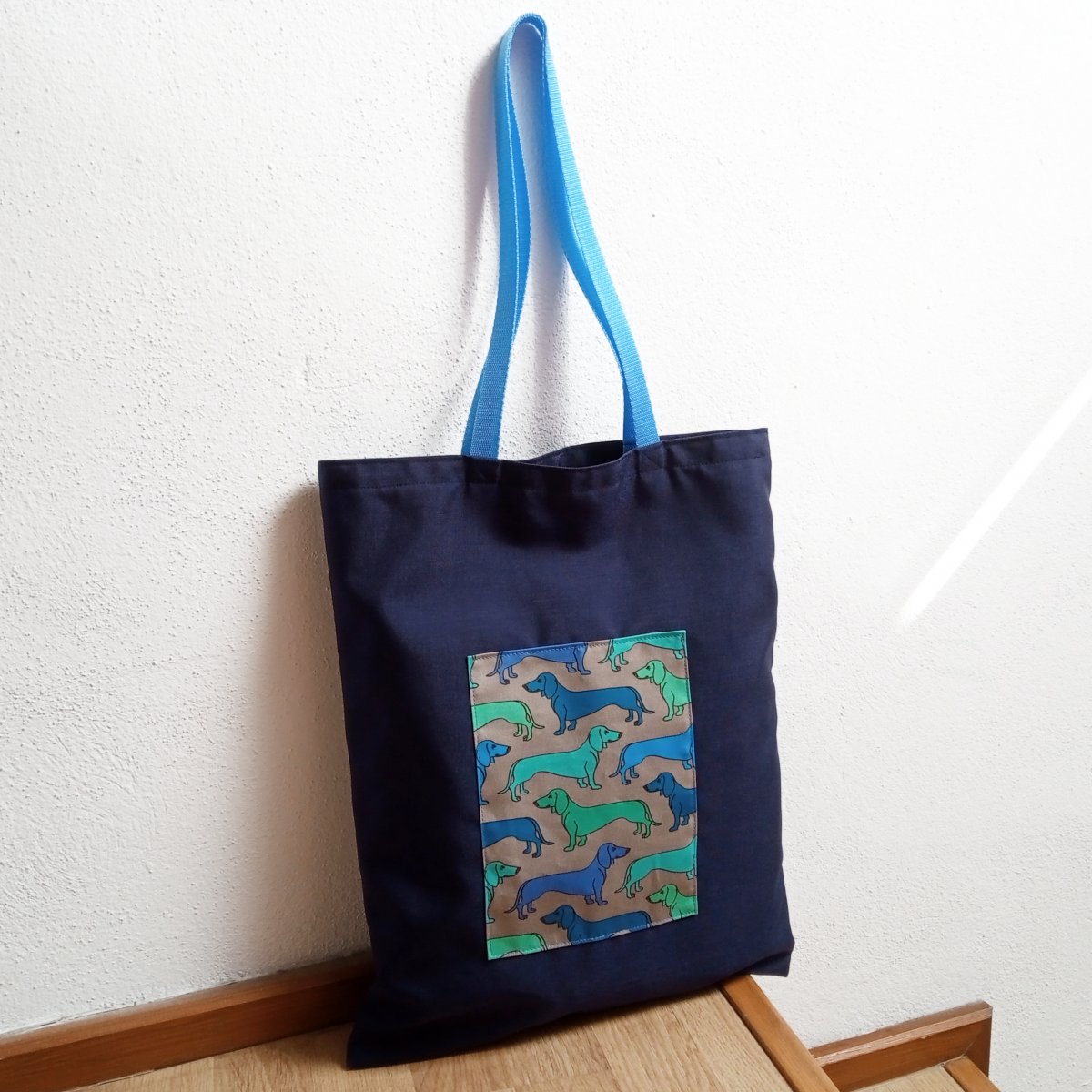 Taška z pevné směsové tmavě modré látky, z jedné strany doplněná bavlněným panelem s jezevčíky. Rozměry jsou 43,5 cm/35,5 cm. Uši jsou z modrého popruhu o šíři 20 mm a výšce přibližně 28 cm.
