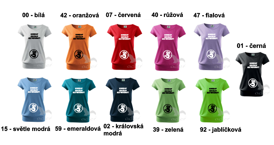 V PŘÍPADĚ, ŽE BARVU NEUVEDETE, BUDE VÁM ZASLÁNO TRIKO V ZÁKLADNÍ VERZI A TO JE V BARVĚ 00-BÍLÁ.