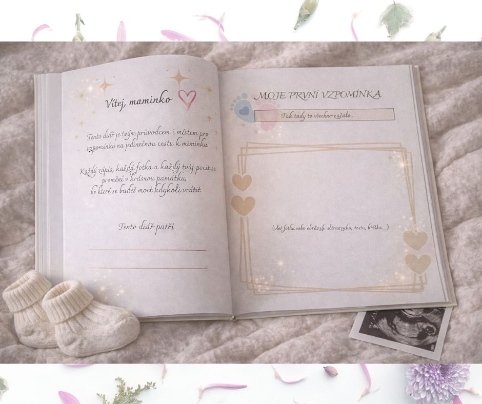 Pokud hledáte místo, kam bezpečně uložit každou emoci, fotku ultrazvuku i první společný zážitek, tento diář je vytvořena právě pro vás.