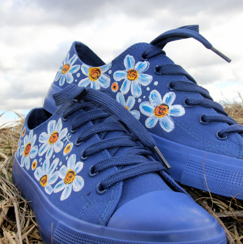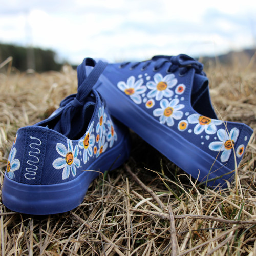 Krásně tmavě modré včetně podrážky, s veselým kopretinkovým zdobením ze všech stran.