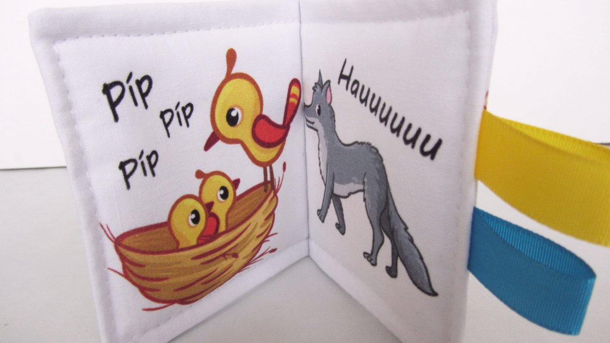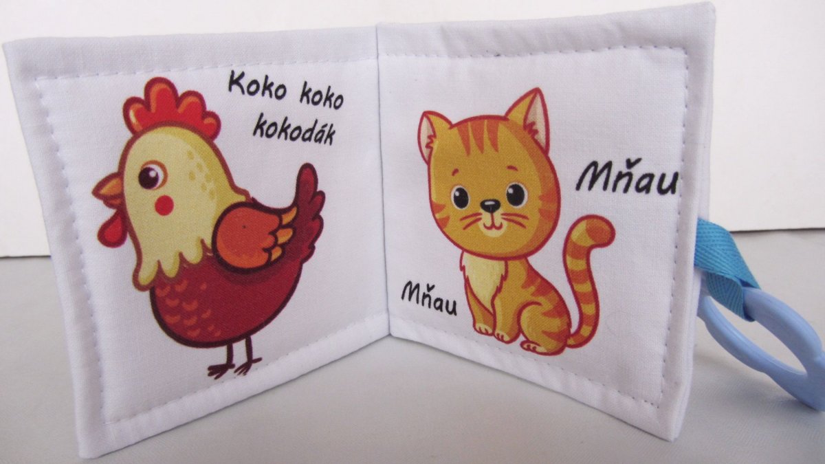 Textilní knížka udělá radost vašim dětičkám a zabaví je na chvíle vašeho odpočinku. Knížka je ušitá z bavlněné látky s atestem pro děti do tří let věku dítěte. Kniha je vyztužena vlizelínem, vyplněná rounem. Ze strany jsou všité stužky na kterých si dětičky cvičí jemnou motoriku a plastové kousátko . Velikost obrázků je 9 x 10 cm.