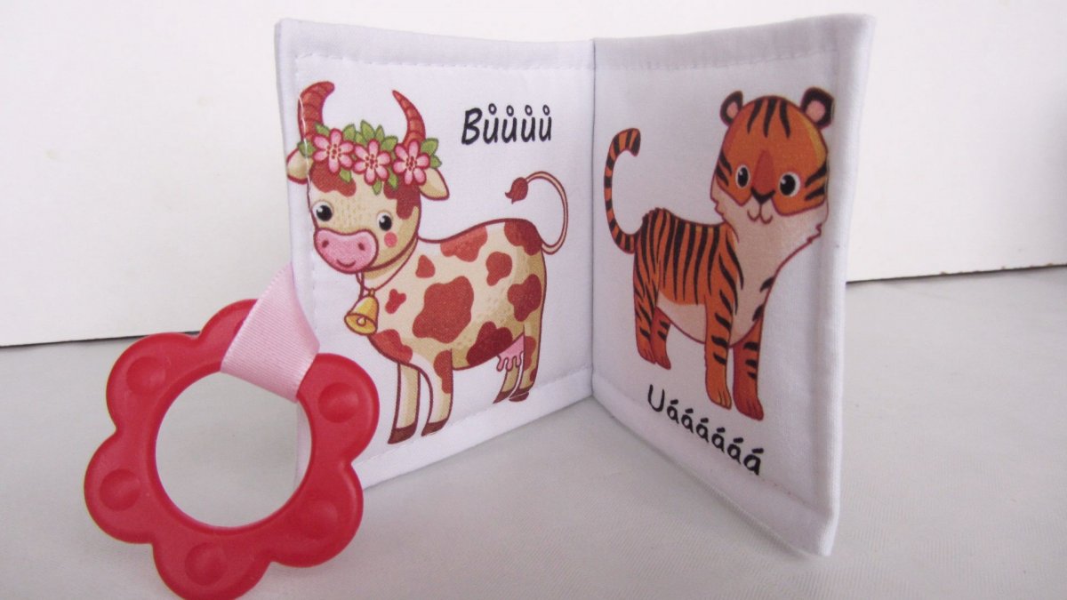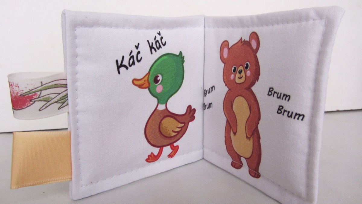 Textilní knížka udělá radost vašim dětičkám a zabaví je na chvíle vašeho odpočinku. Knížka je ušitá z bavlněné látky s atestem pro děti do tří let věku dítěte. Kniha je vyztužena vlizelínem, vyplněná rounem. Ze strany jsou všité stužky na kterých si dětičky cvičí jemnou motoriku a plastové kousátko . Velikost obrázků je 9 x 10 cm.