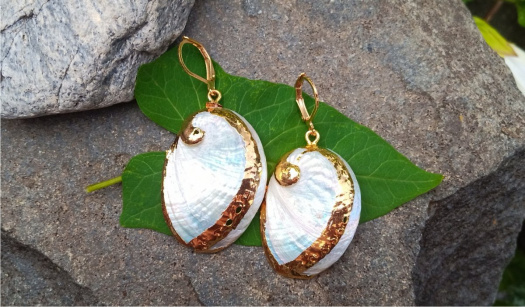 Fantasticky opalizující dokonale lesklé bílé vzácné mušle z Tichého oceánu s nádhernými perleťovými odlesky ze všech stran s pozlaceným zdobením zavěšené na zavíracích pozlacených háčcích. Velikost mušlí cca 33x24 mm.
