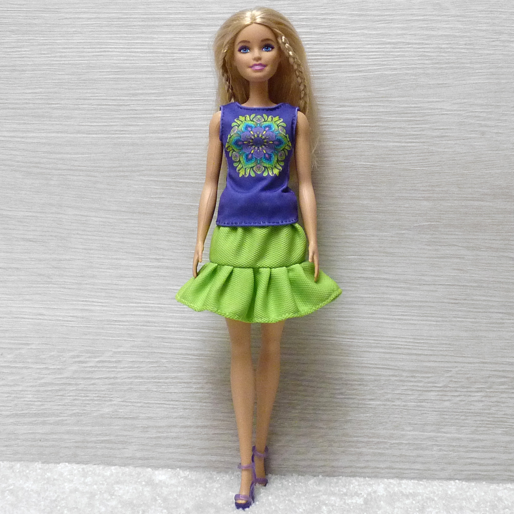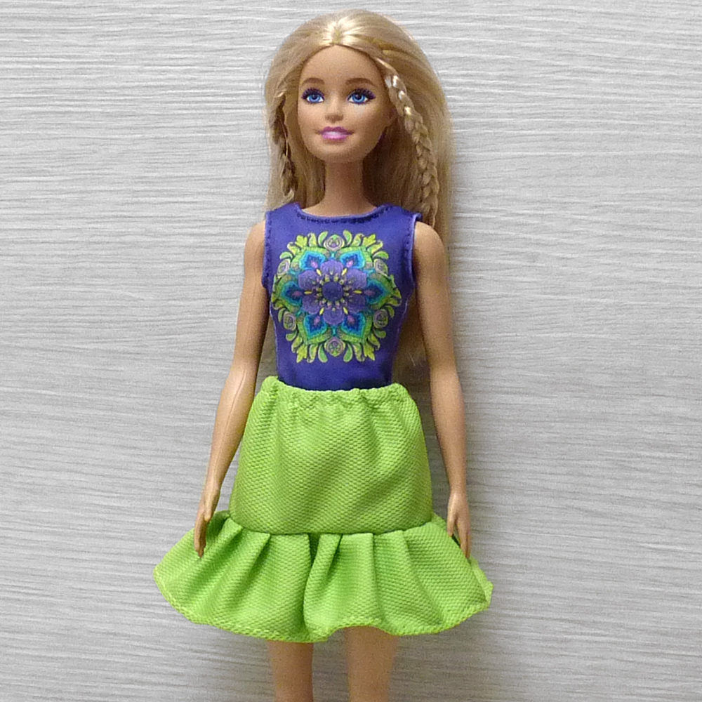 Fialové tílko s mandalou a krátká nabíraná sukýnka s volánkem pro Barbie.