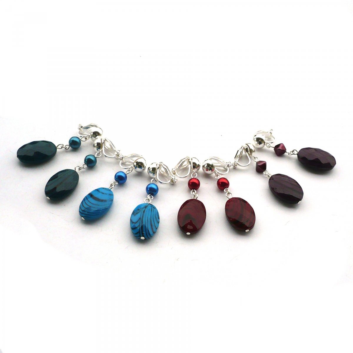 Jednoduché krátké klipsové náušnice jsou tvořeny horní tmavě fialovou voskovanou perličkou a tmavě fialovým plastovým oválkem s nepravidelnými černými proužky.