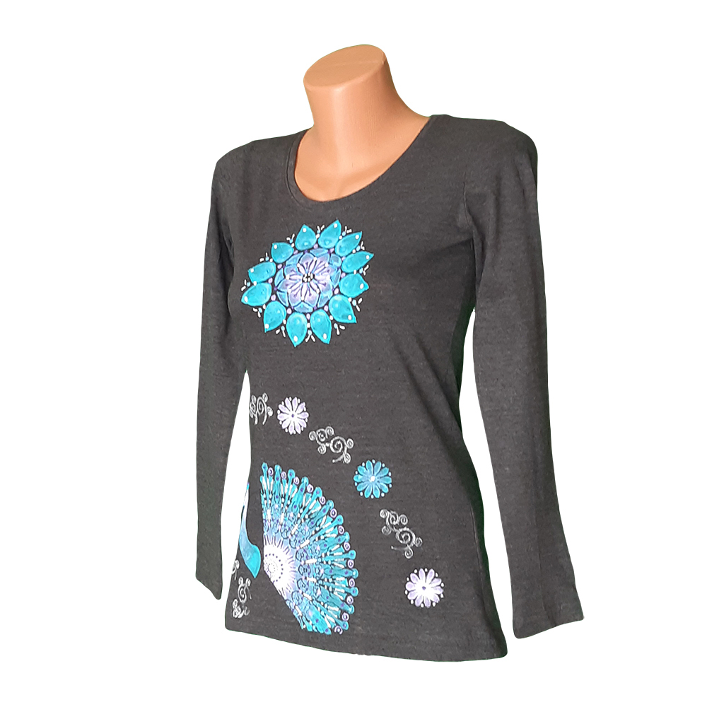 Dámské, dívčí, tmavě šedé melítrované tričko, ručně malované s dlouhým rukávem. Malování světle i tmavě fialovou, světle modrou, světle tyrkysovou a bílou barvou.