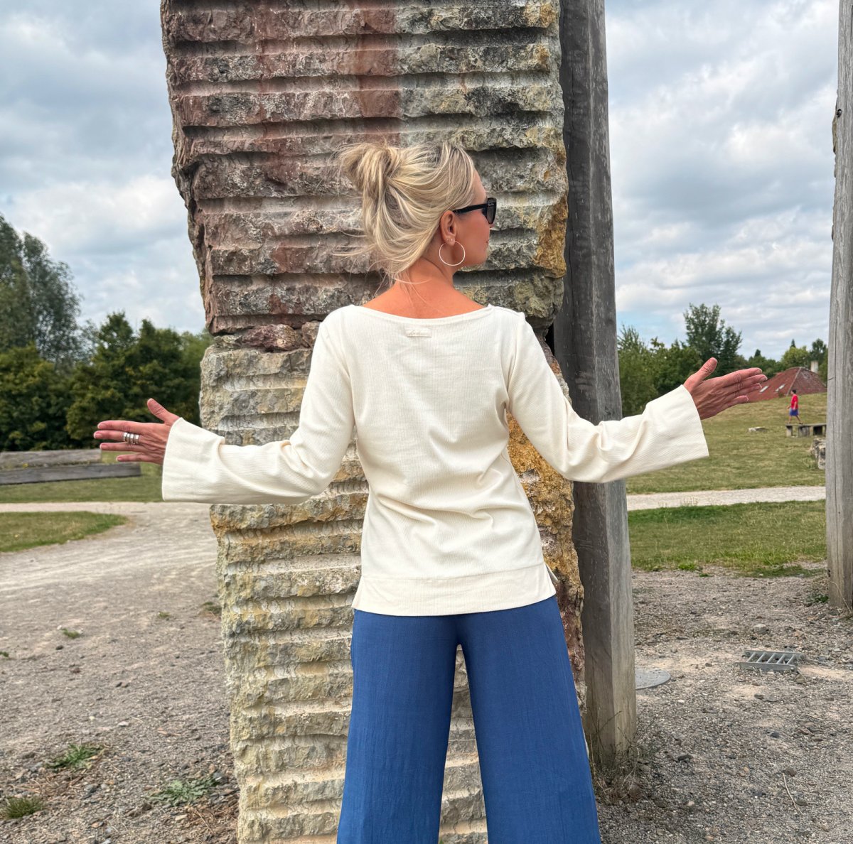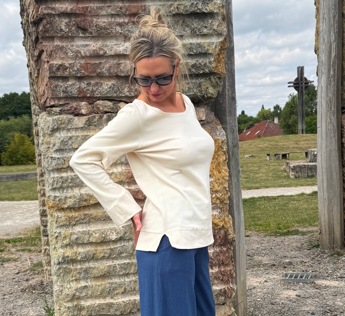 Střih je volný s širokými rukávy. v bocích rozparky.