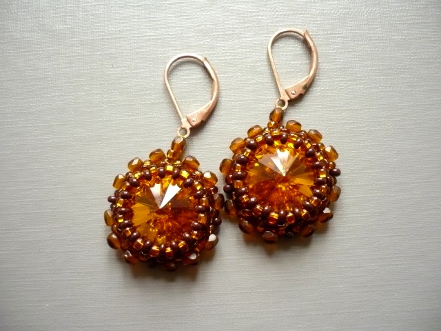 Ručně šité náušnice z kvalitního rokajlu Preciosa. Uprostřed je žlutý kamínek Swarovski. Zadní strana náušnic je také obšita korálky, zavěšeno na měďeném komponentu z obecného kovu. Velikost 2,2 cm bez háčku. Použity barvy korálků hnědá a zlatá. Doplněno skleněnými ohňovkami.