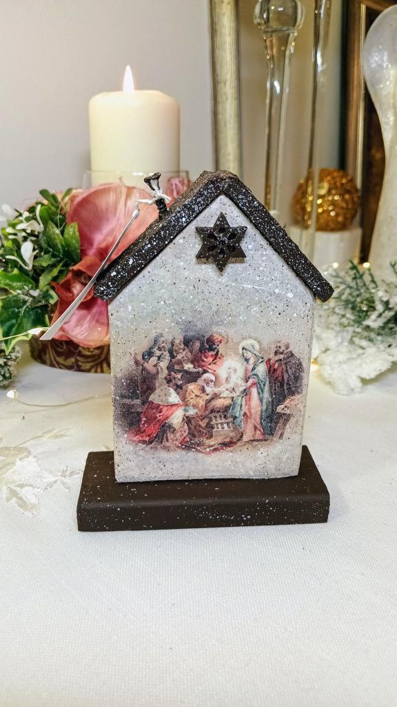 Dřevěný domeček s motivem narození Ježíška, svaté rodiny a příchod tří králů do Betléma. Domeček je na dřevěném podstavci, ve štítu domku je hvězdička a střecha je reliéfně zdobená. Celý domek je lehce patinovaný. Domeček je vhodný do betlémů, nebodo dekorací, nebo jen samostatně stojící.