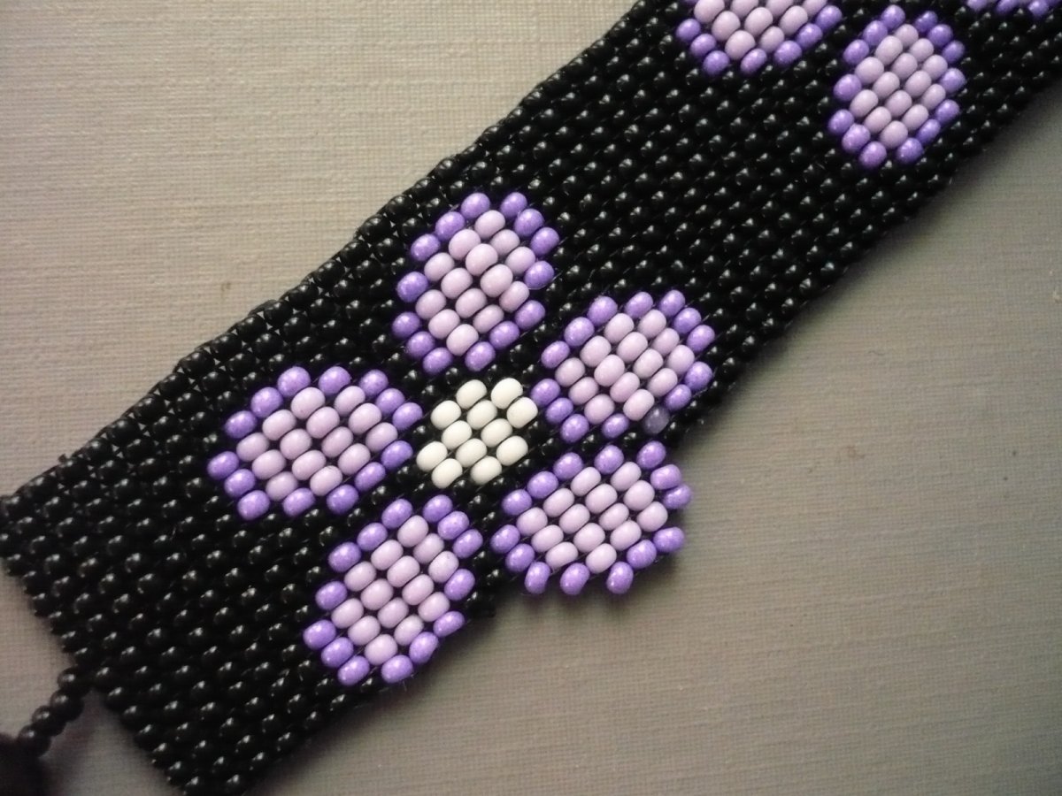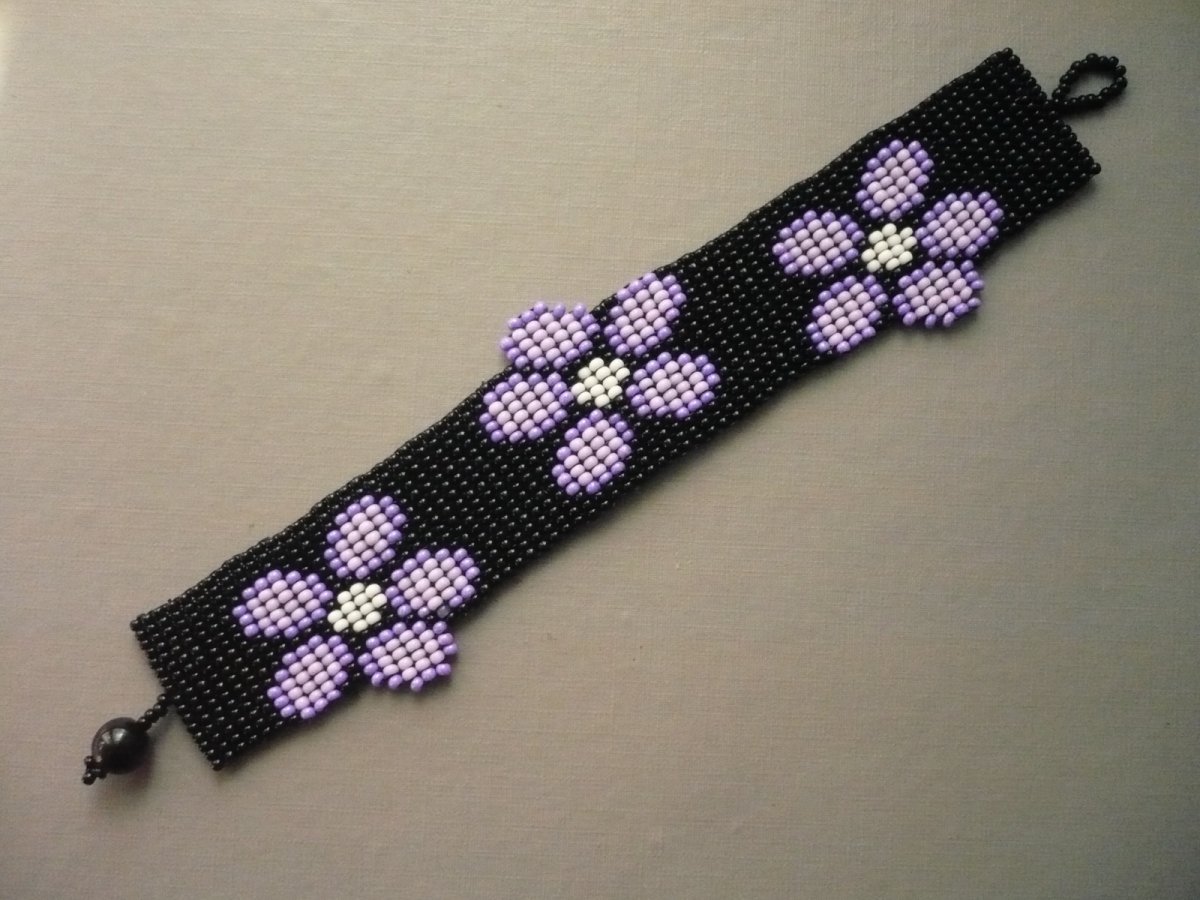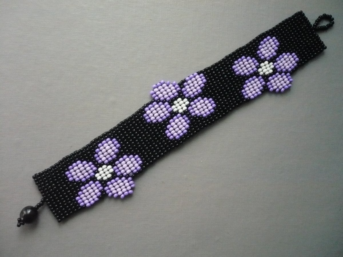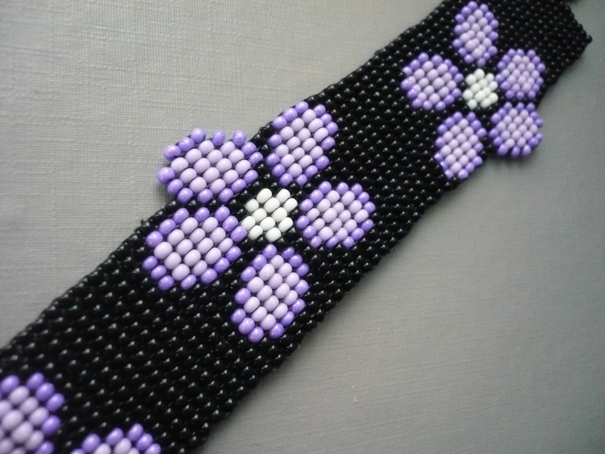 Luxusní ručně šitý náramek z rokajlových korálků. Šířka v nejširším místě 3 cm, délka na ruku max. 17,7 cm. Zapínání na kuličku a očko. Náramek je pevný, zapínání šito vlascem. Lze vyrobit na přání v různých délkách a barvách, ozvěte se vnitřní poštou!