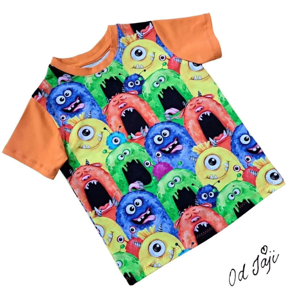 Dětské tričko ve veselých barvách, s motivem barevných bubáků.