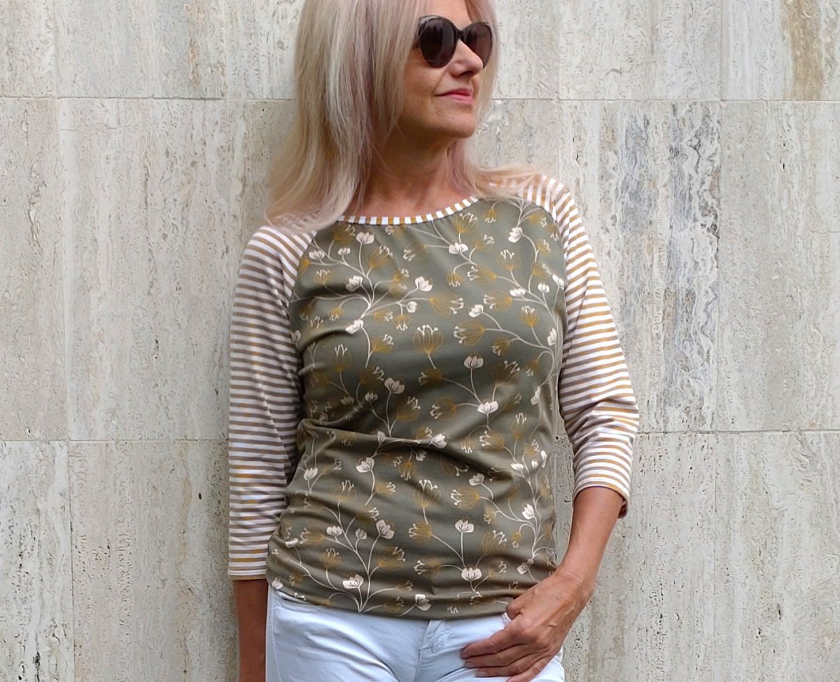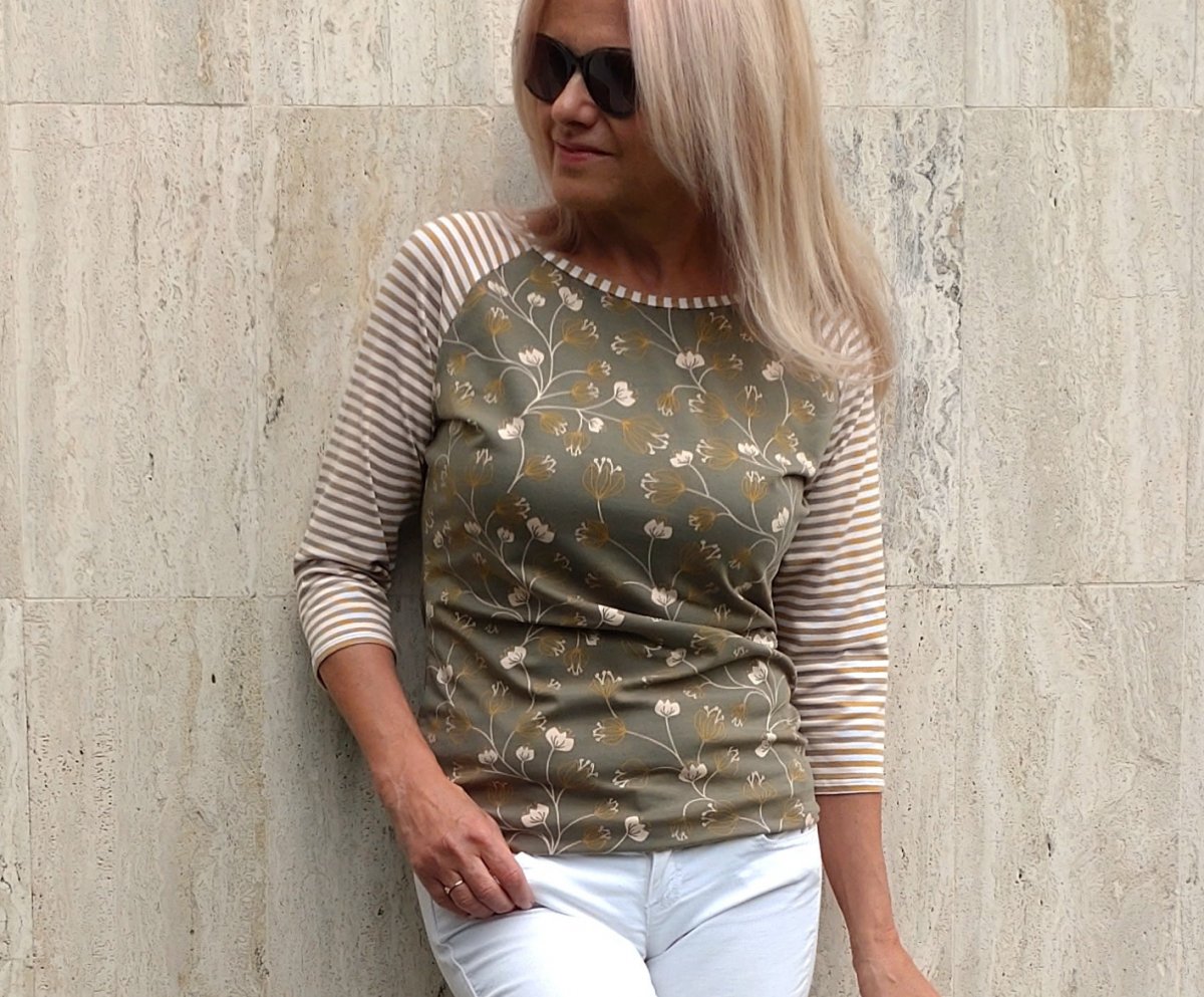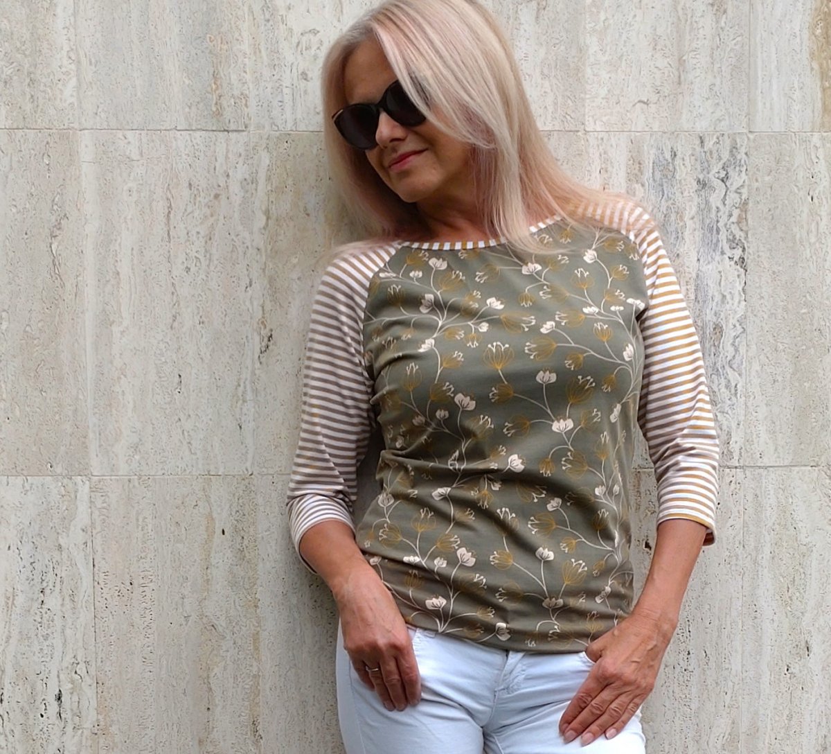 Raglánové tričko z elastického úpletu ve složení bavlna s lycrou. Kombinace vzájemně ladících potisků.