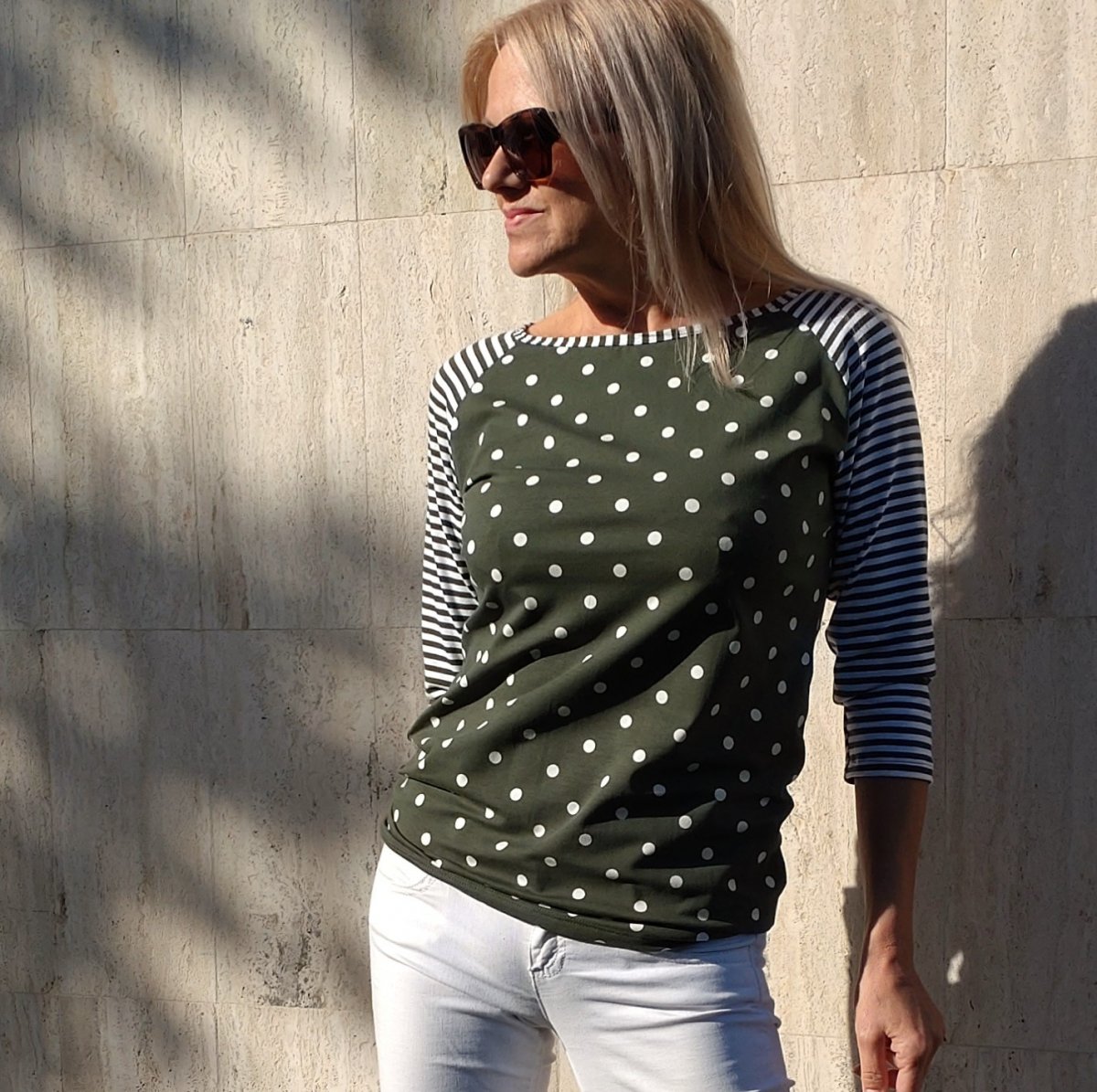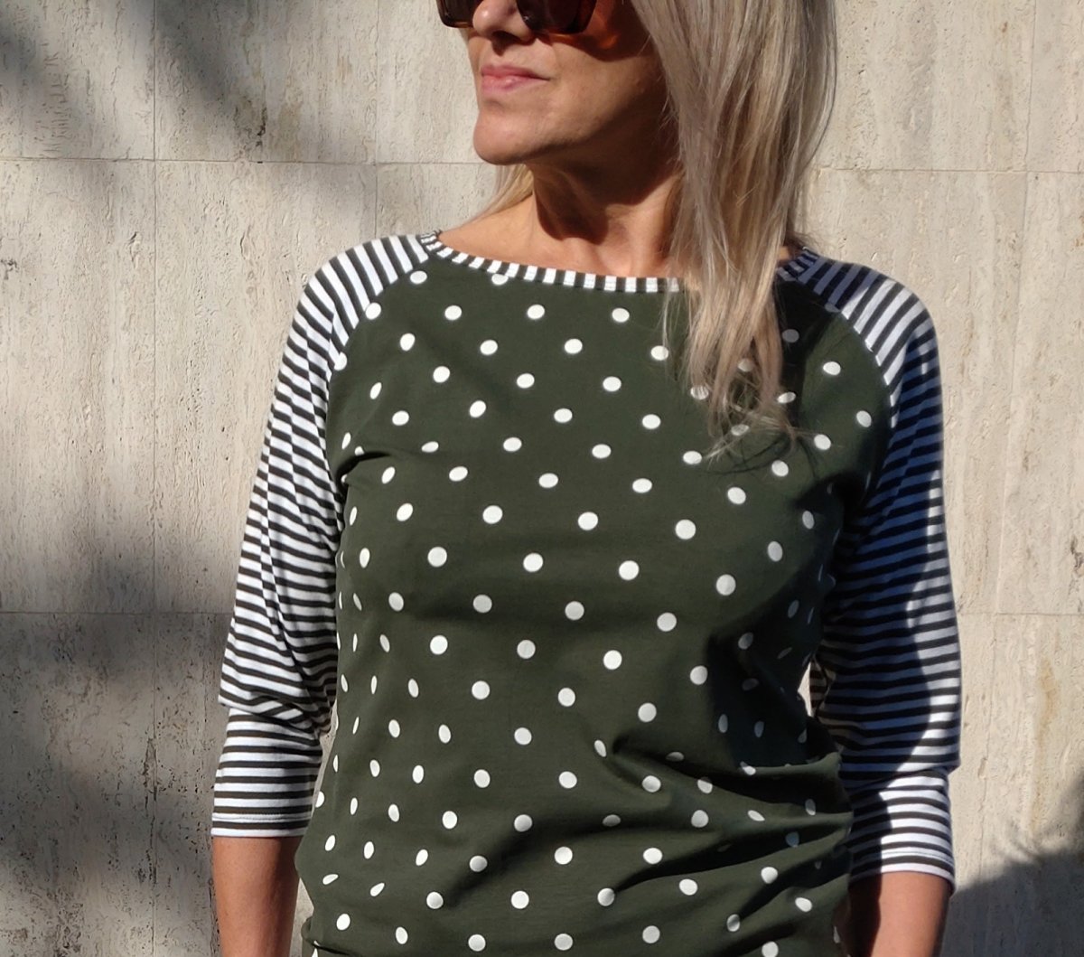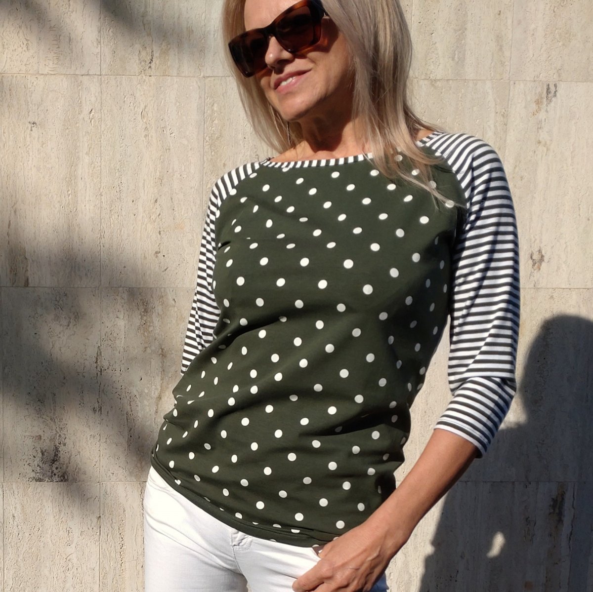 Raglánové tričko z elastického úpletu ve složení bavlna s lycrou. Kombinace vzájemně ladících potisků v khaki zelené barvě.