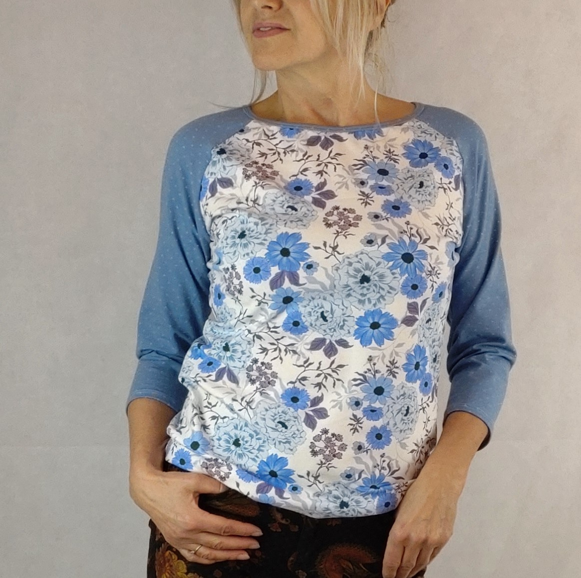 Raglánové tričko z elastického úpletu ve složení bavlna s lycrou. Kombinace vzájemně ladících potisků.