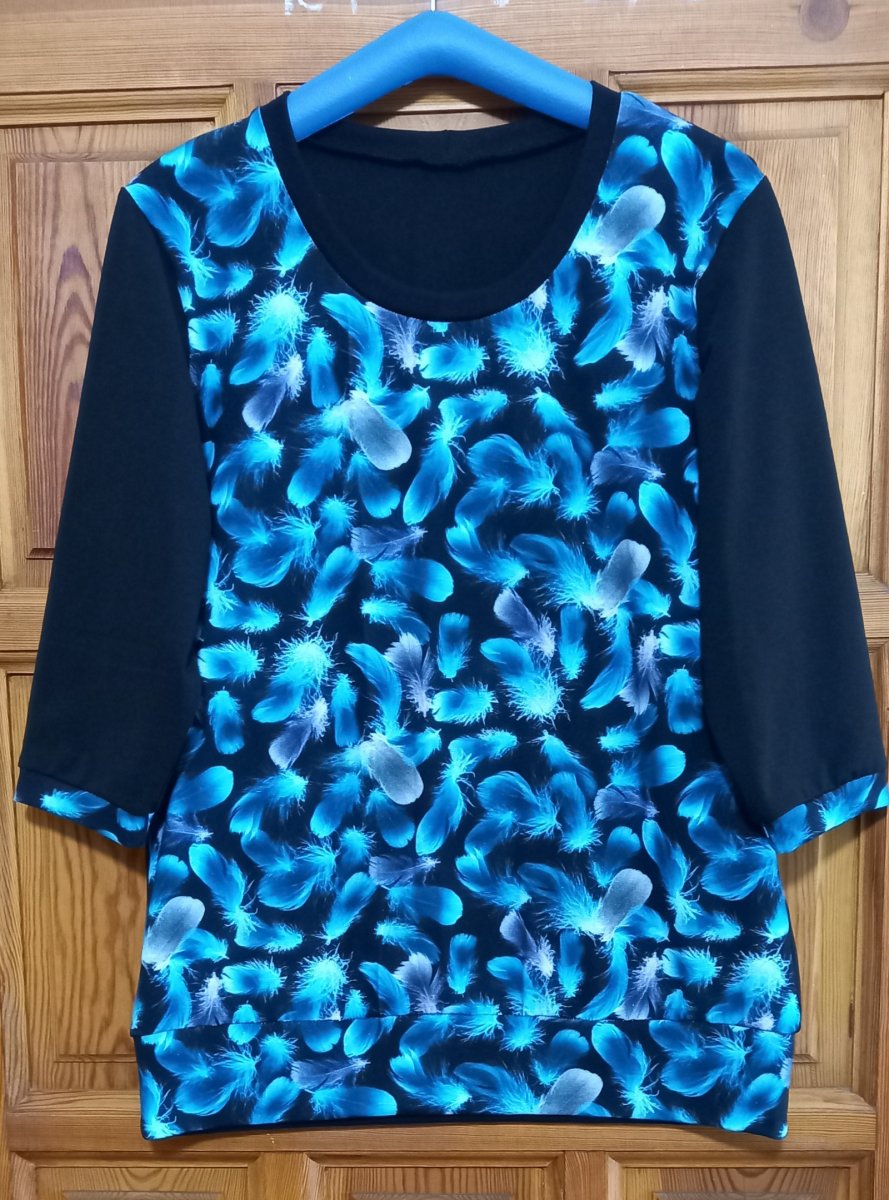 Střih je mírně projmutý, vsazené 3/4 rukávy, kulatý výstřih, v pase do lemu.