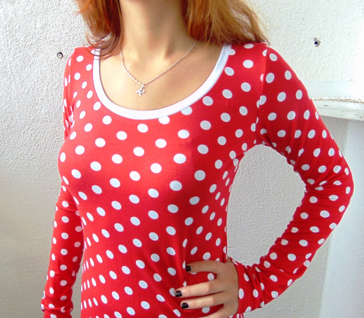 Střih je mírně projmutý, kulatý výstřih, vsazené dlouhé rukávy.
