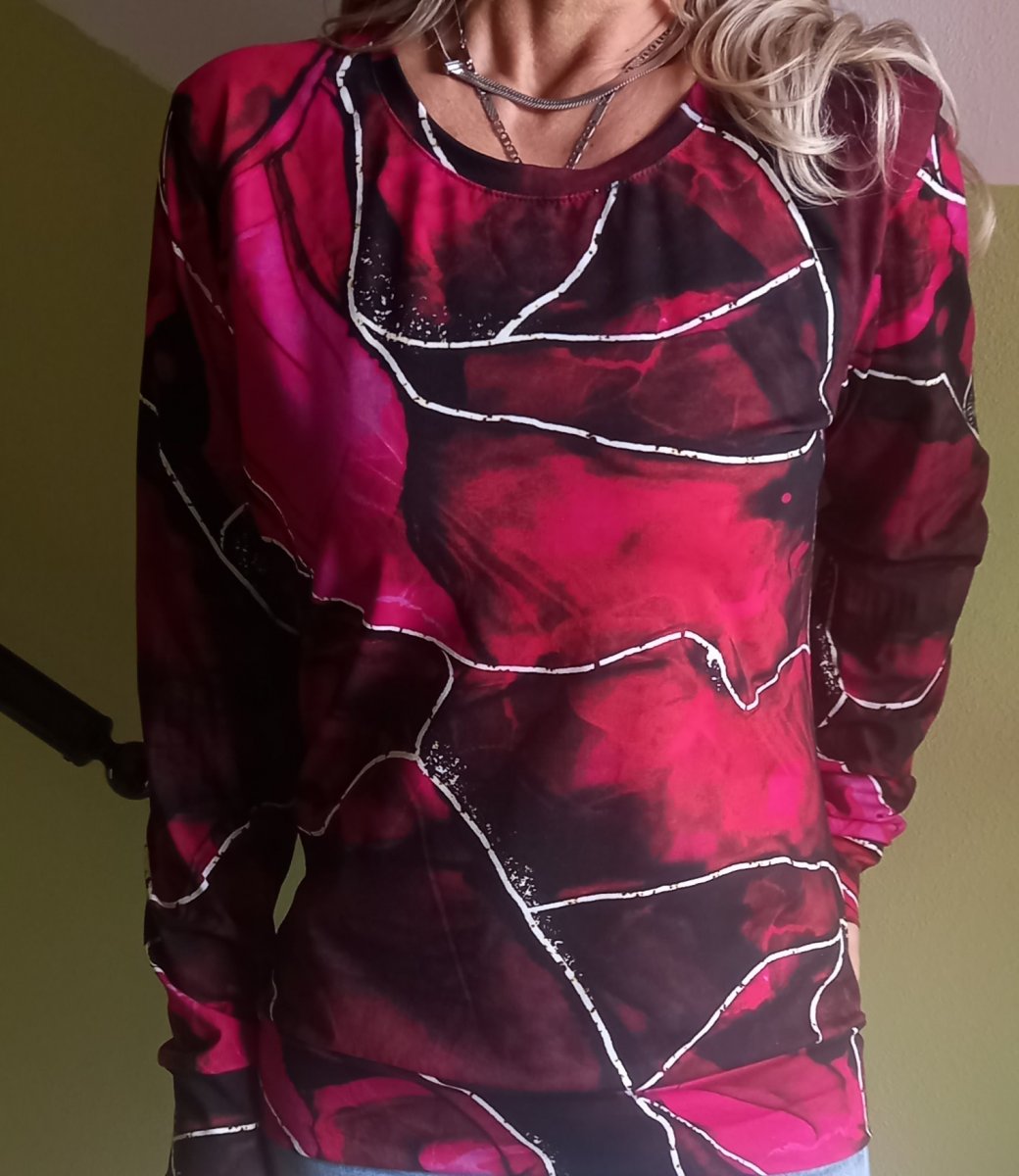 Střih je mírně projmutý, vsazené dlouhé rukávy, kulatý výstřih, v pase do lemu.