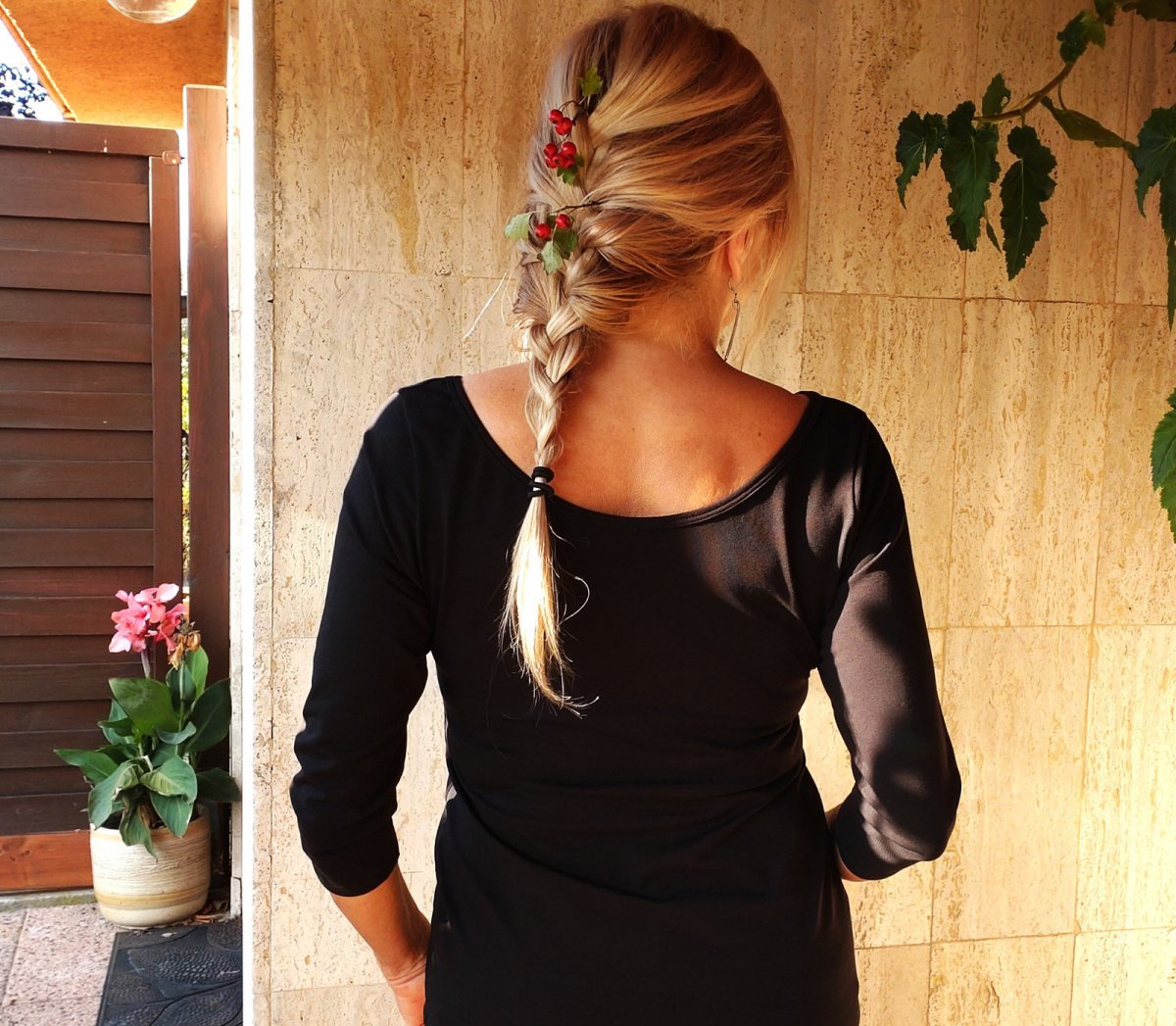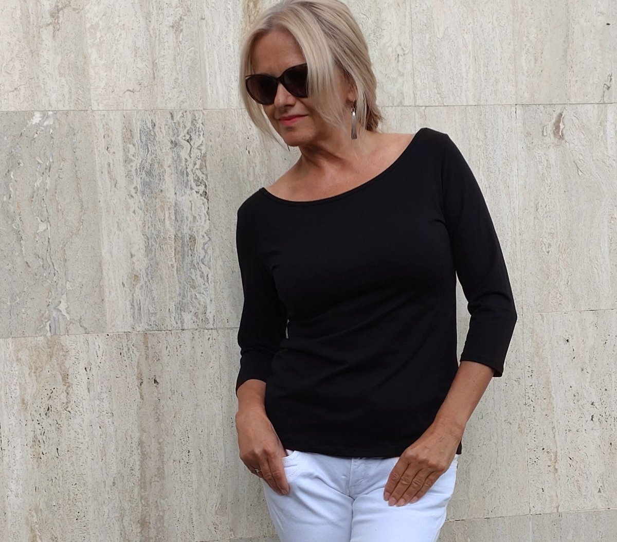 Hluboký a široký lodičkový výstřih, zadní výstřih hlubší.