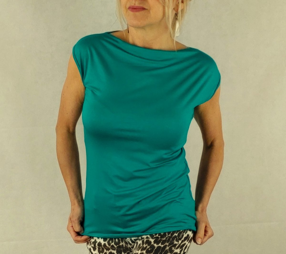 Ušité z kvalitního elastického úpletu viscóza s lycrou. Široký lodičkový výstřih, krátký spadený rukávek.