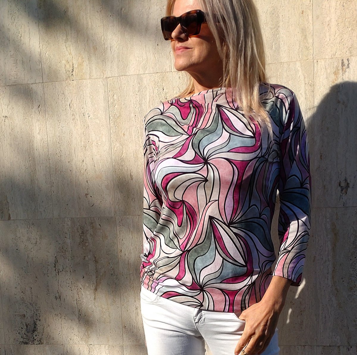 Jednoduchá elegance se založeným lodičkovým výstřihem a 3/4 rukávem.