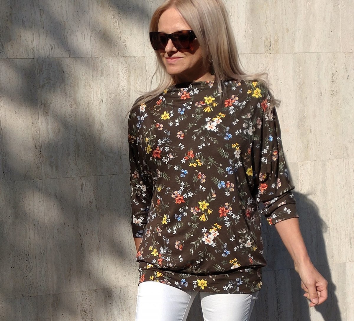 Rovný lodičkový výstřih ke krku, pohodlný střih kryjící nedostatky postavy. Spodní lem dvojitý, pružný.