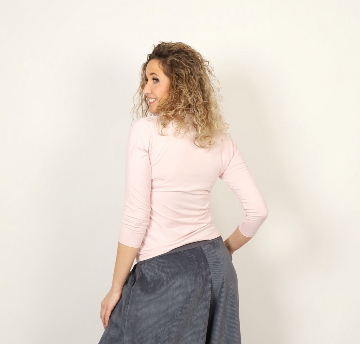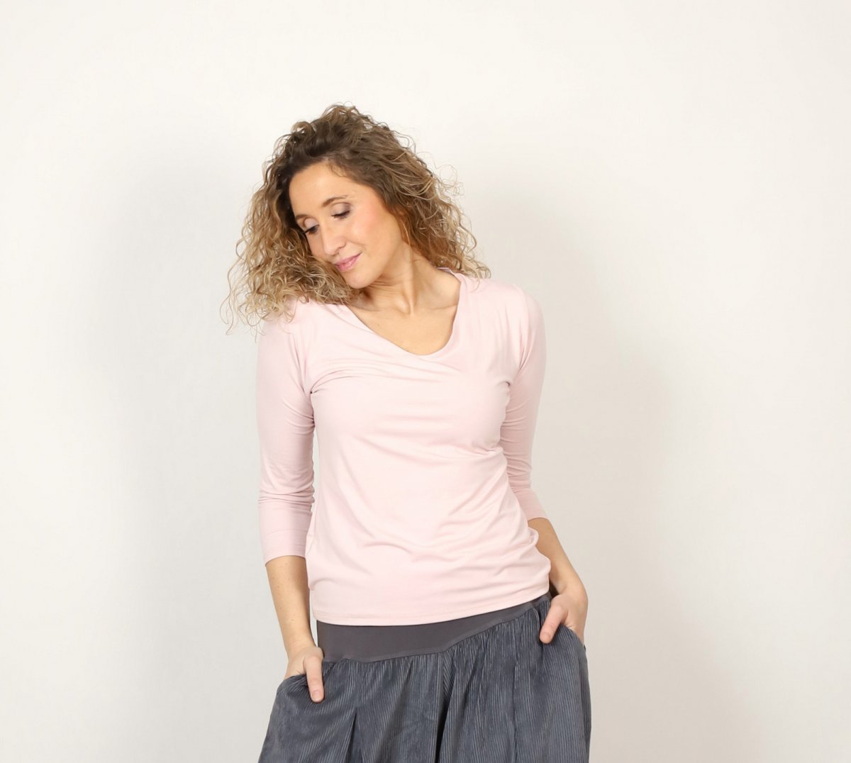 Tričko s výstřihem do V je ušité z příjemného materiálu viskóza/elastan. Přední díl je zdvojený a rukávy mají 3/4 délku.