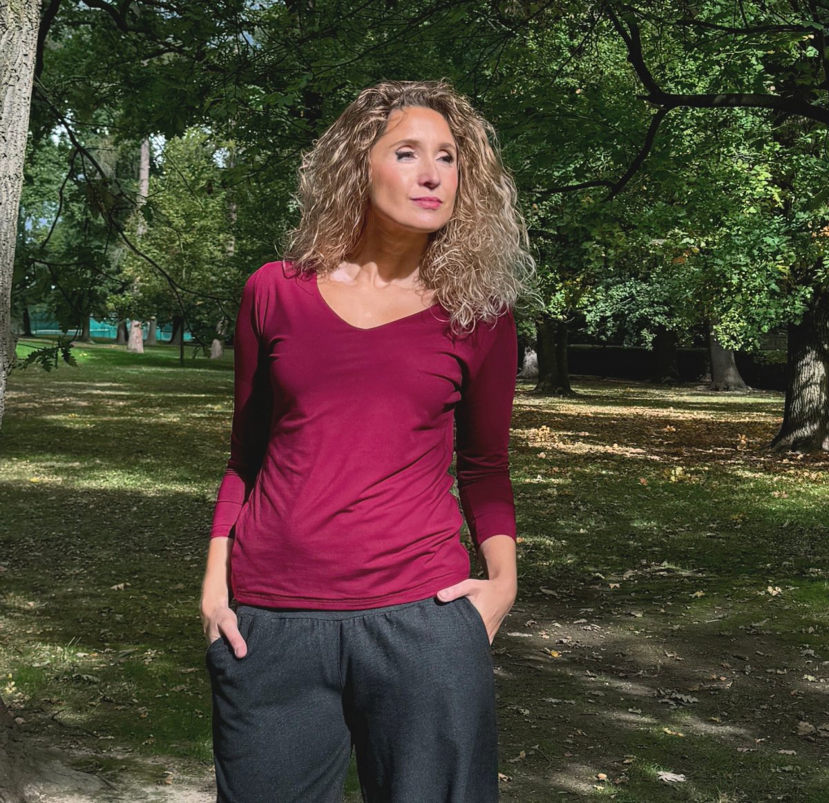 Tričko s výstřihem do V je ušité z příjemného materiálu viskóza/elastan. Přední díl je zdvojený a rukávy mají 3/4 délku.