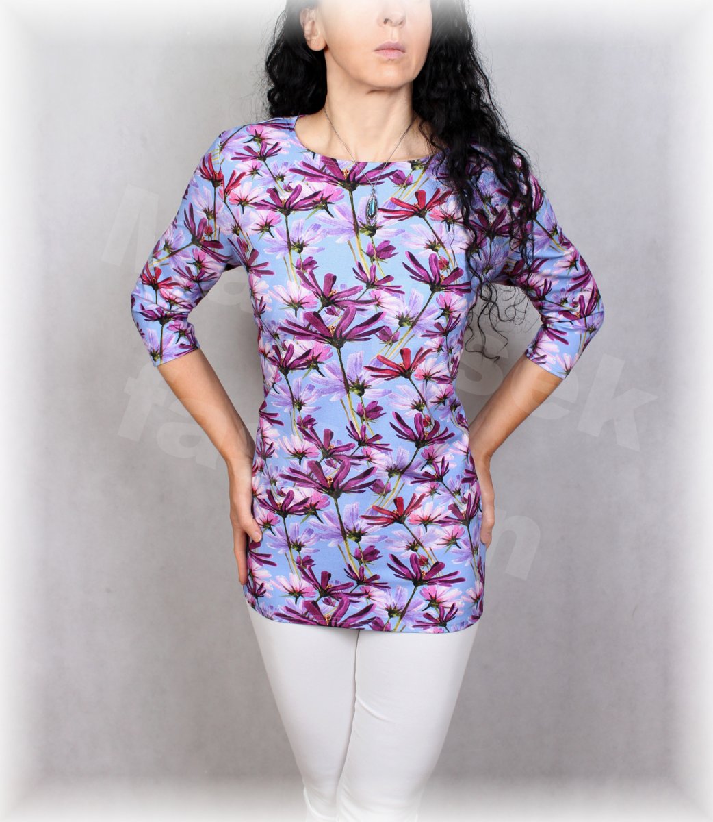 Triko z viskózového úpletu.Možno ušít i s krátkým rukávem nebo s jiným výstřihem.