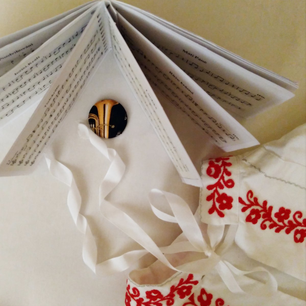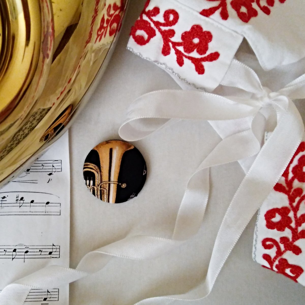 Brož, brožka, brošňa, button, buttonek, látka, bavlna, látková brož, kruh, kolo, lehká, bílá, kulatá brož, drobná, odznak, odznáček, šití, šitá brož, nit, potahování, button, buttonek, buttonová, buttonková, nota, noty, hudba, hudební brož, rytmus, černá, tuba, zlatá