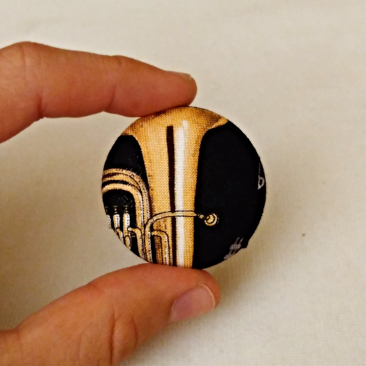 Hudebná brož o průměru 45 mm je vyrobena technikou potahování z černé látky s obrázkem zlaté tuby. Ze zadní strany brožové lůžko.