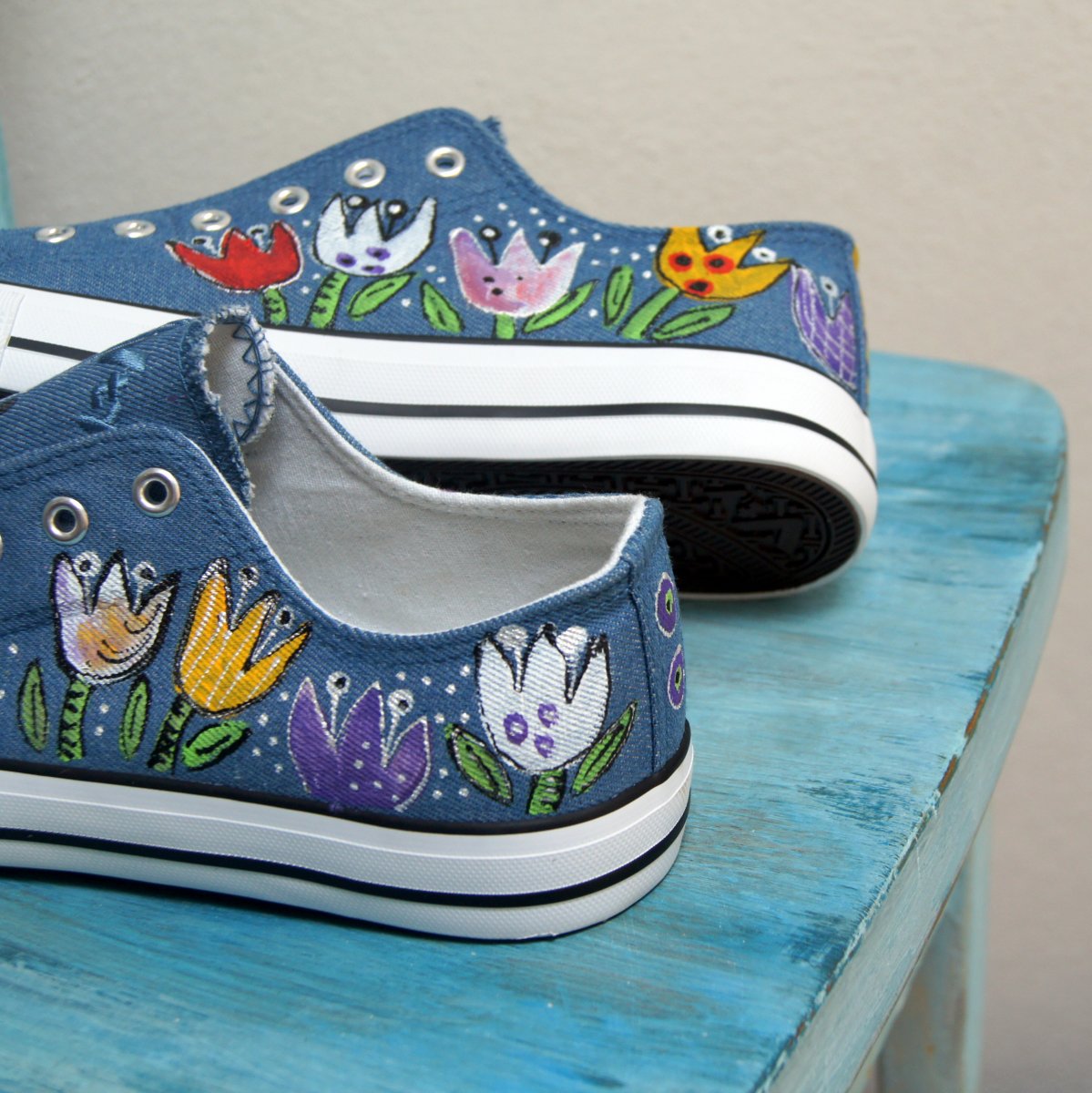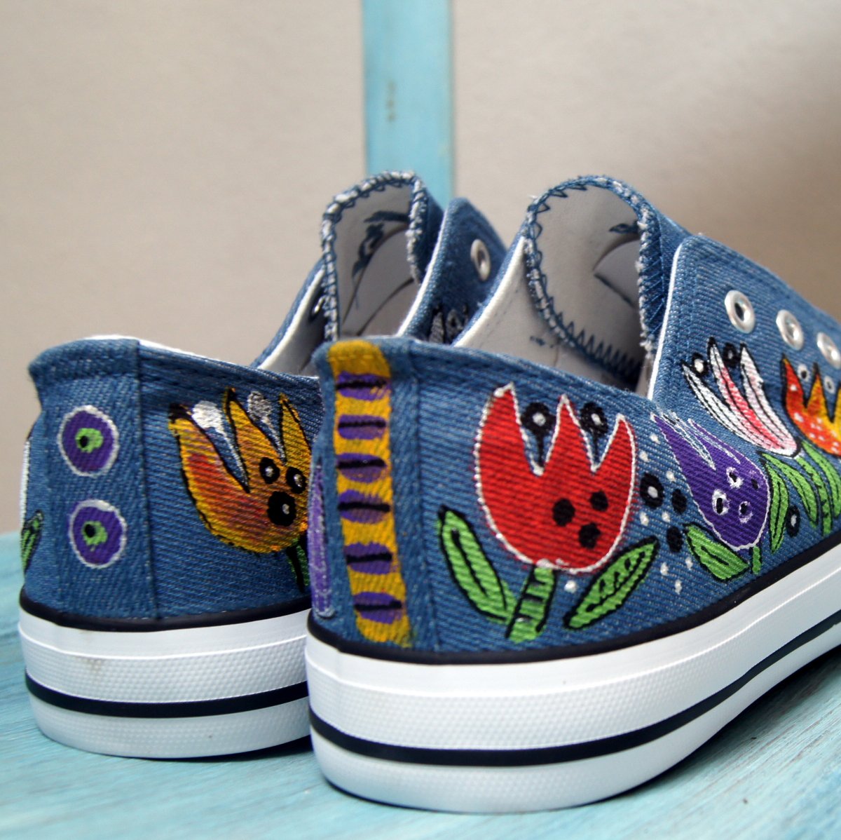 Ručně malované bílé botičky, tenisky, plátěnky - bez tkaniček, všitá guma bezvadně drží na nožce