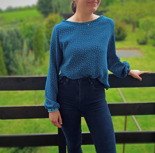 Tunika z mušelínu/dvojité gázoviny. Hodí se k džínám i k sukni. Lodičkový výstřih. Rukávy jsou staženy do gumičky.