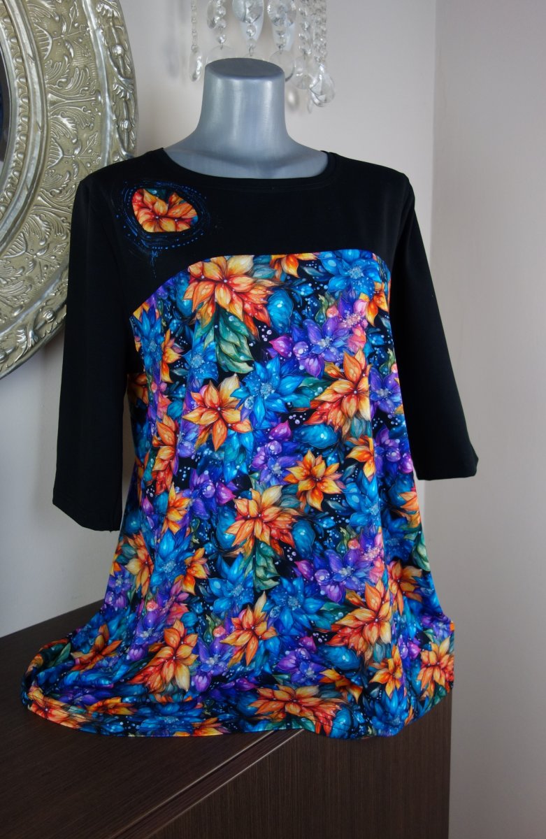 Tunika Ačkového střihu s pestrým vzorem . Barevný úplet je jemnější materiál - viskoza/elastan. Černý úplet je bavlna s elastanem lehčí gramáže. Tuniku lze nosit celoročně. Rukávy na obrázku 3/4délky. U výstřihu malá aplikace.