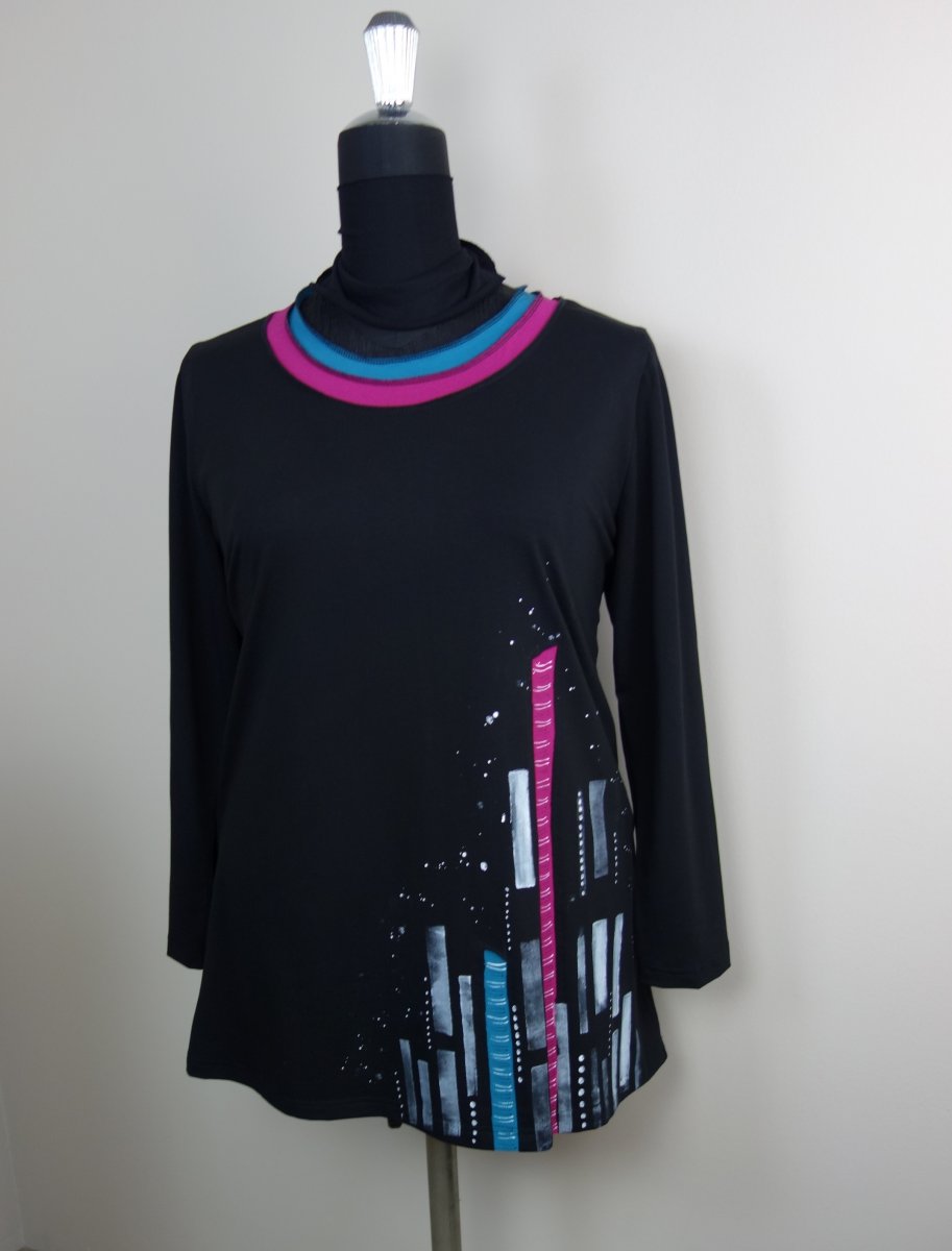 Originální tunika Ačkového střihu. Kombinace černého úpletu s ruční malbou a barevným úpletem. Úplet příjemné lehčí gramáže vhodný po celý rok :)