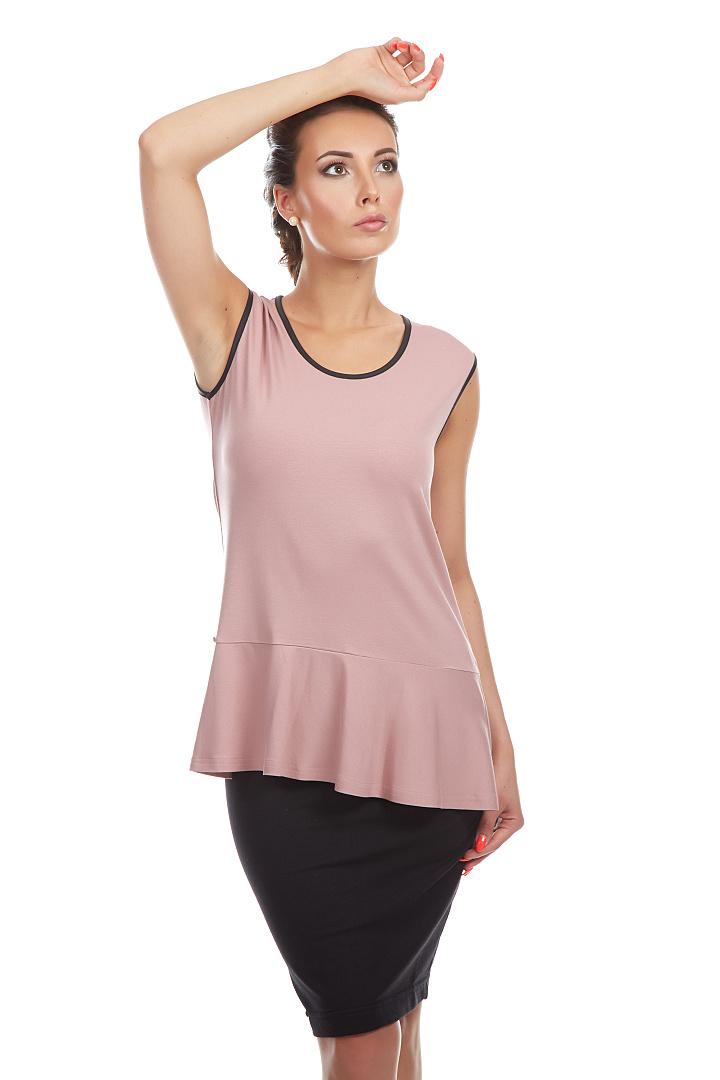 Tunika bez rukávů je mírně projmutého střihu zakončená 15 cm širokým módním volánem.