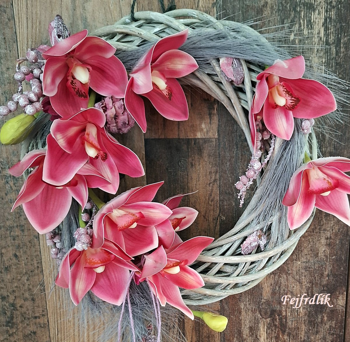 Věnec šedý s umělými (latex) orchidejemi , pampovaou trávou a sušinou v růžové barvě.
