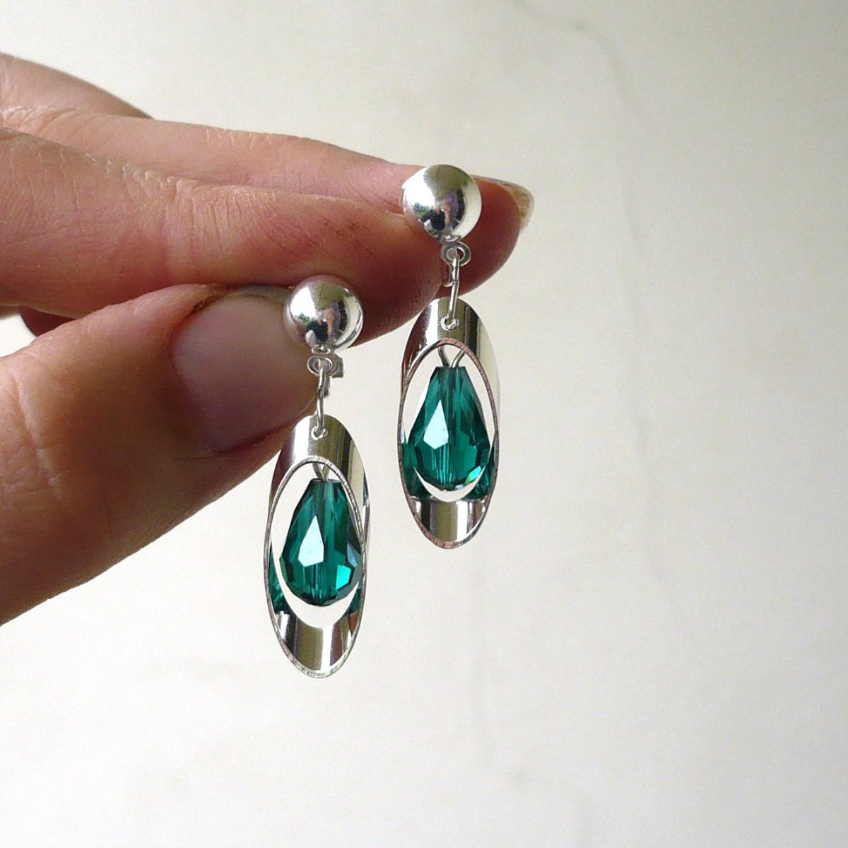 Tyrkysová broušená skleněná kapka s odlesky je umístěna v oválném 3D komponentu stříbrné barvy.