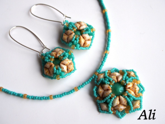 Přívěsek náhrdelníku je vytvořen z tyrkysové rivolky Matubo. Ta je obšita českými korálky diamonduo a japonským rokajlem Toho v tyrkysové a medové barvě. Přívěsek je zavěšen na bižuterním lanku ozdobeným stejným rokajlem. Lanko je zakončeno karabinkou z bižuterního kovu ve stříbrné barvě.