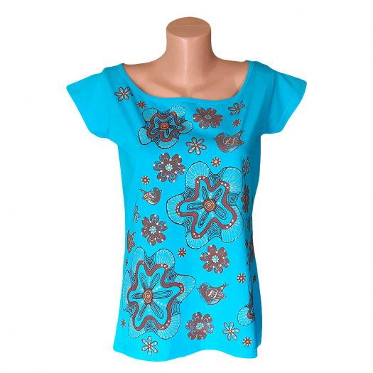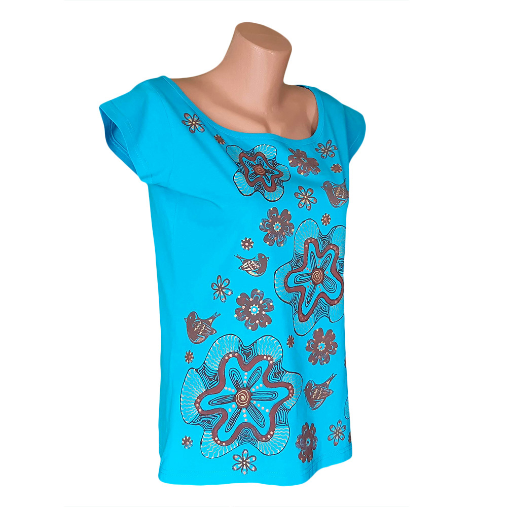 Ručně malované a potištěné dámské tričko s krátkým rukávem, 100% bavlna, neprosvítá, lodičkový výstřih.