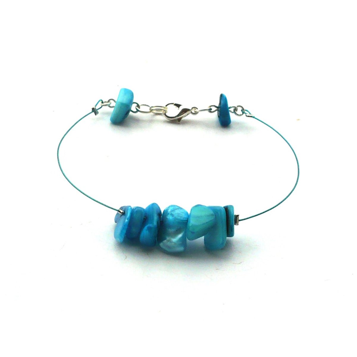 Náramek je vyrobený z tyrkysových perleťových zlomků, které jsou umístěné uprostřed tyrkysového bižuterního lanka, a po jednom z každé strany zapínání.