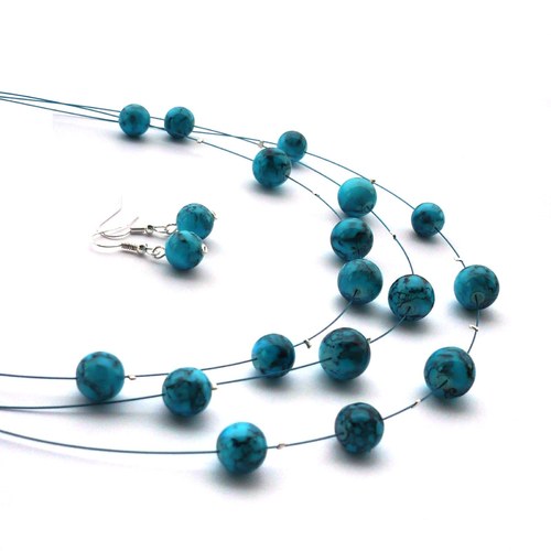 Náhrdelník je tvořený z tří řad různě rozmístěných větších tyrkysovýc skleněných korálků s ozdobnou černou mramorovou kresbou. Ty jsou navlečeny na bižuterním lanku modré barvy.