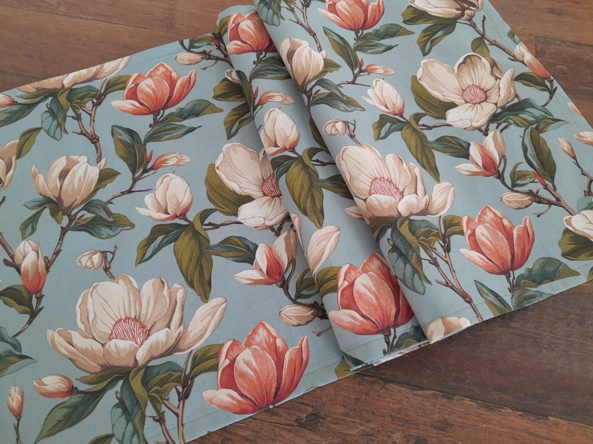 Nabízím středový ubrus, dečku šitou z látky s magnolií na šedo-modrém podkladě.