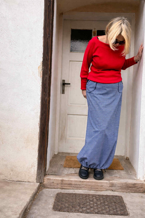 Ušitá z upletu s proužkem v modrobílé barevnosti. Sukně má kapsy.