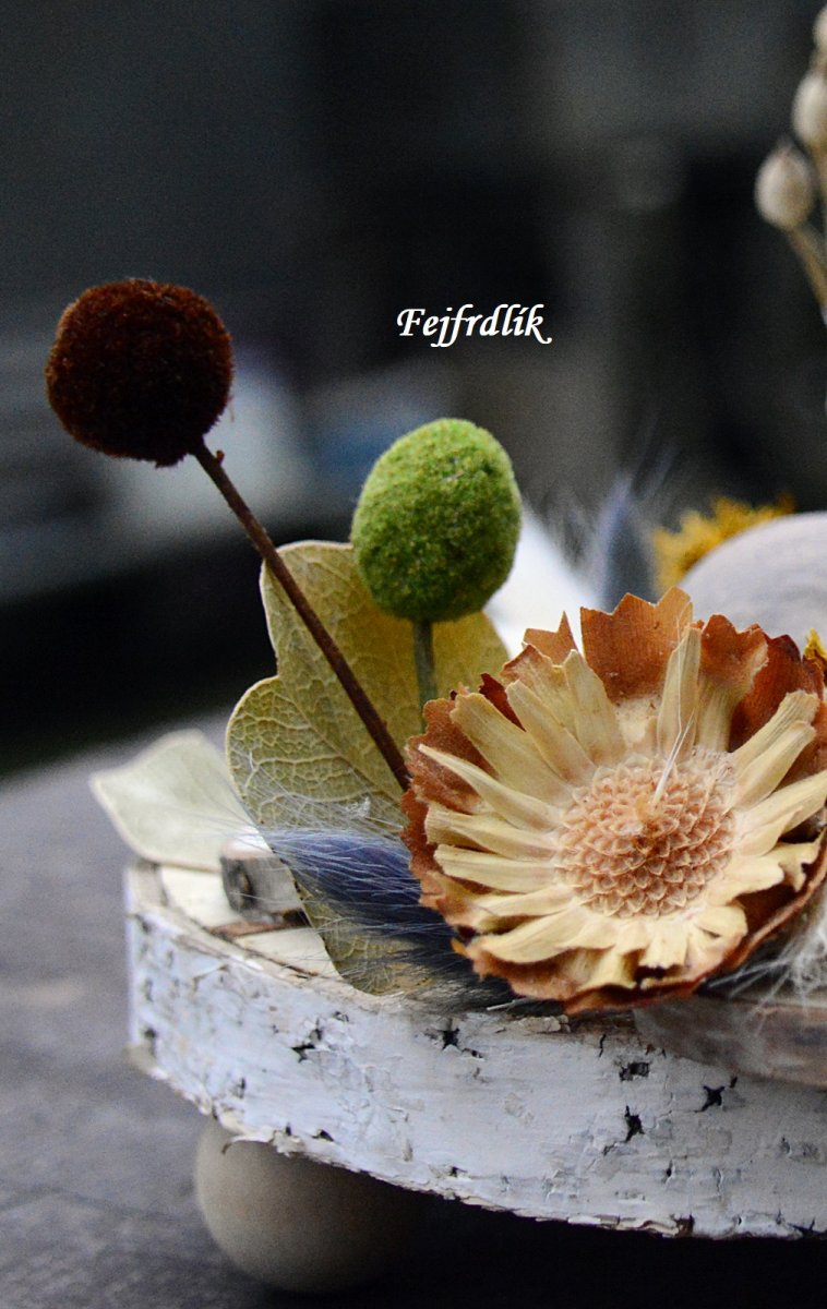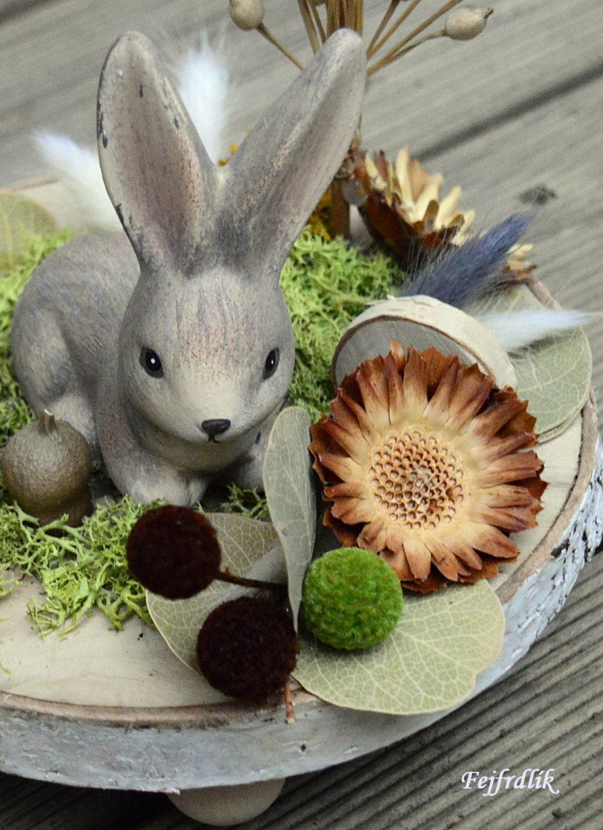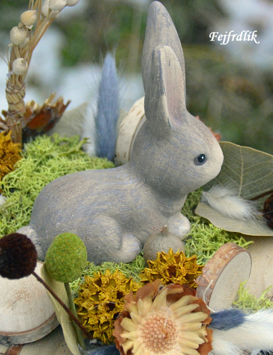 Jarní přírodní dekorace na dřevěné kulatině -trojnožce s keramickým (polyresin)zajíčkem a sušinou mix.