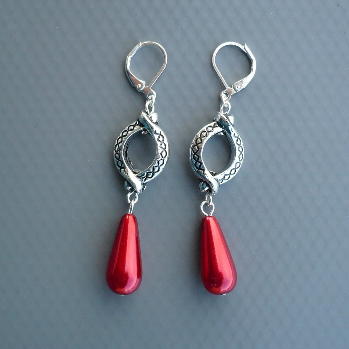 Náušnice jsou z horního ozdobného bižuterního komponentu starostříbrné barvy a pod ním umístěné červené velké voskované skleněné kapky.