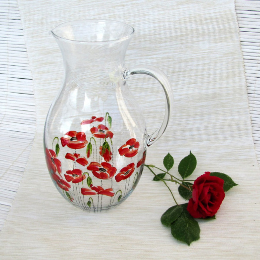 Skleněný džbán malovaný vypalovacími batvami na sklo. Možno použít i na teplý čaj.