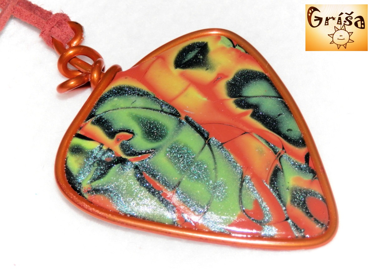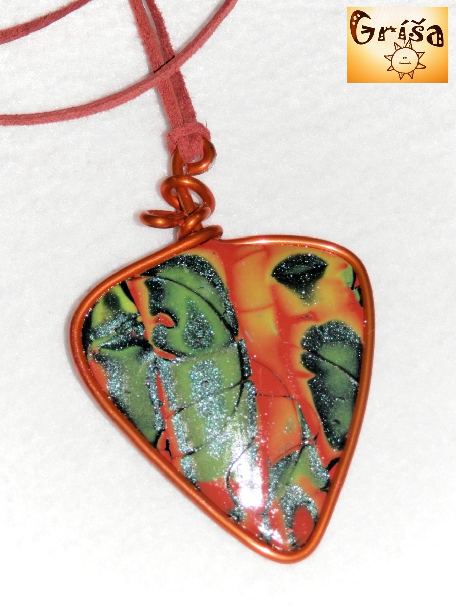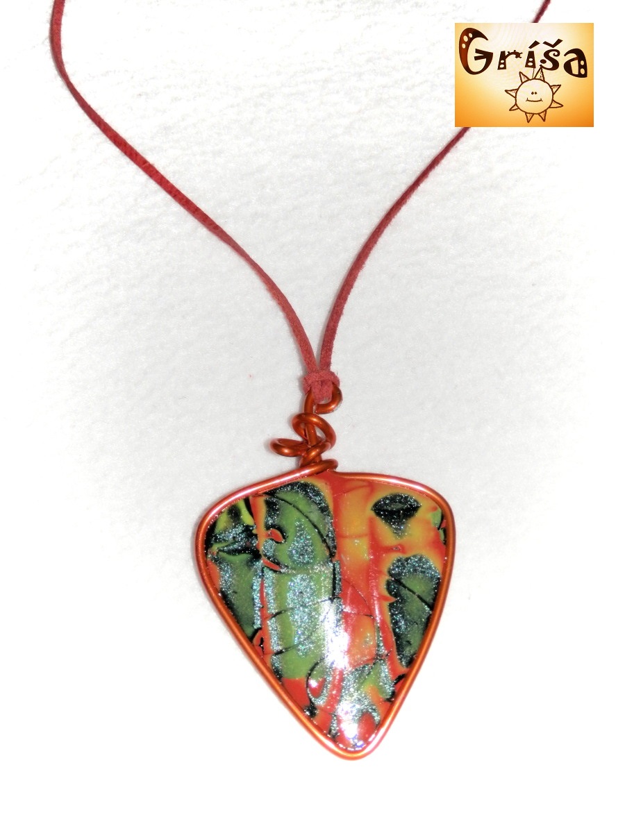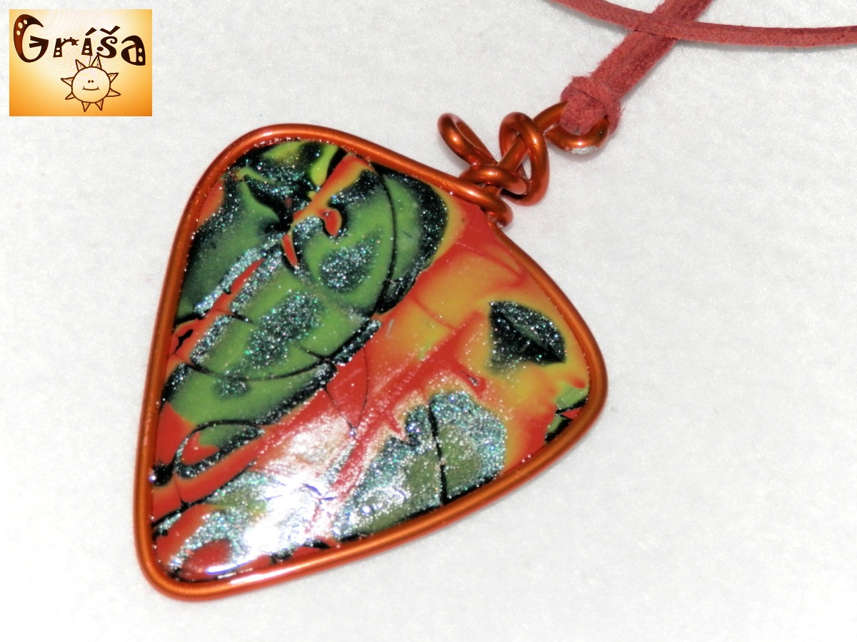 Zavěšeno na ploché kůži barvy terakota o délce 52 cm se zapínáním na karabinku.