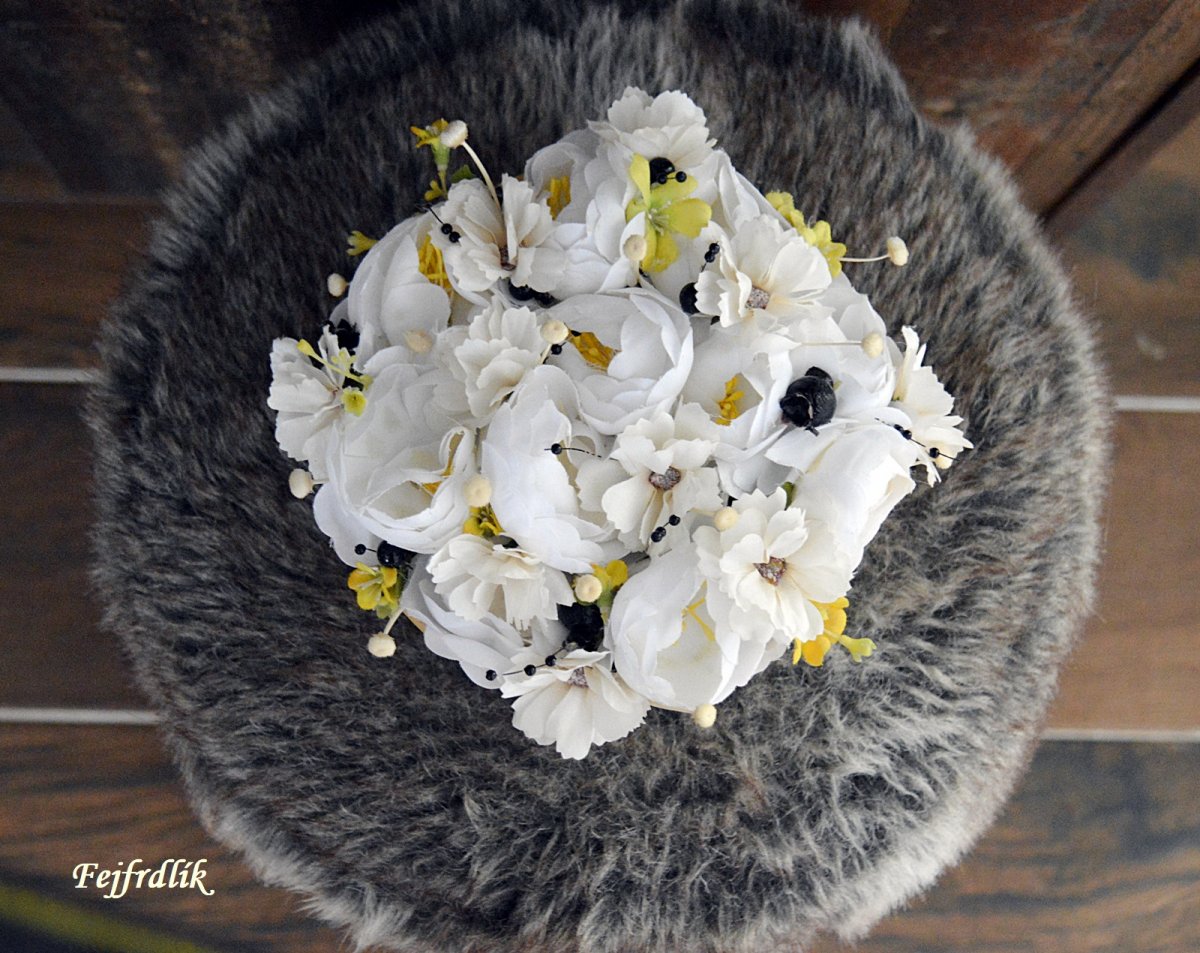Květinové aranžmá s umělými a látkovými květinami, bobulkami a korálky v keramické misce.