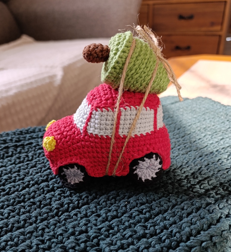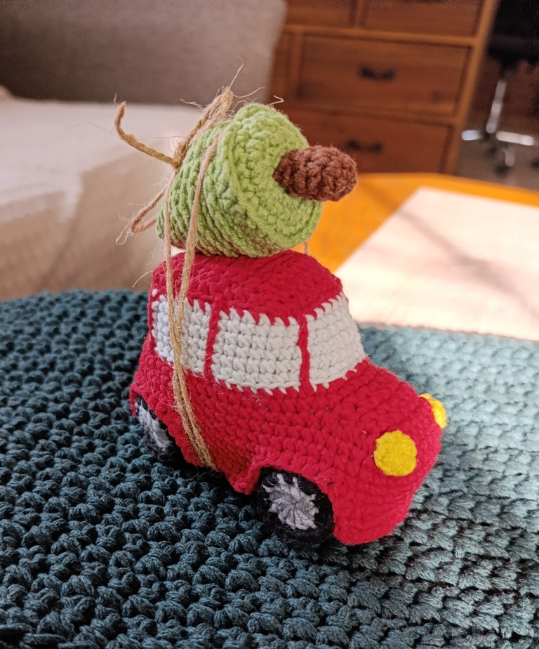Háčkované autíčko, které přiváží stromeček.